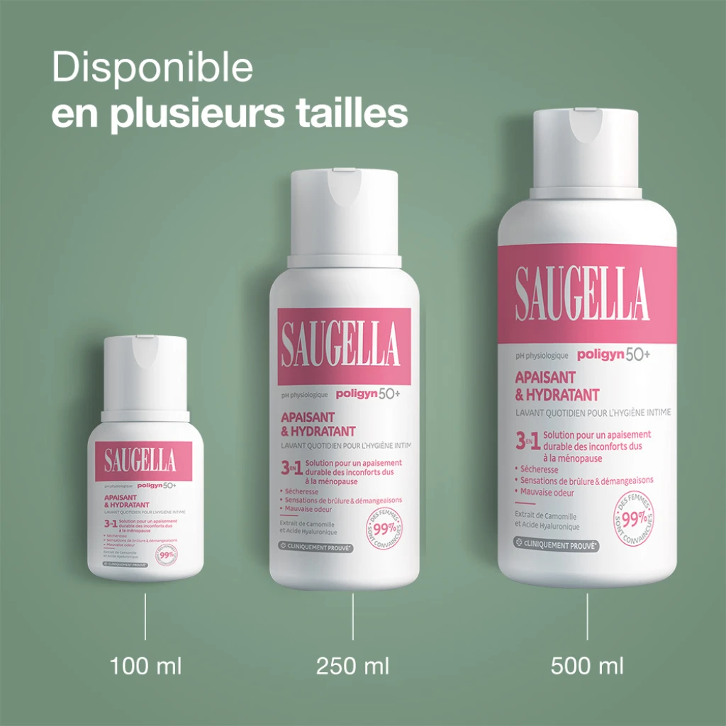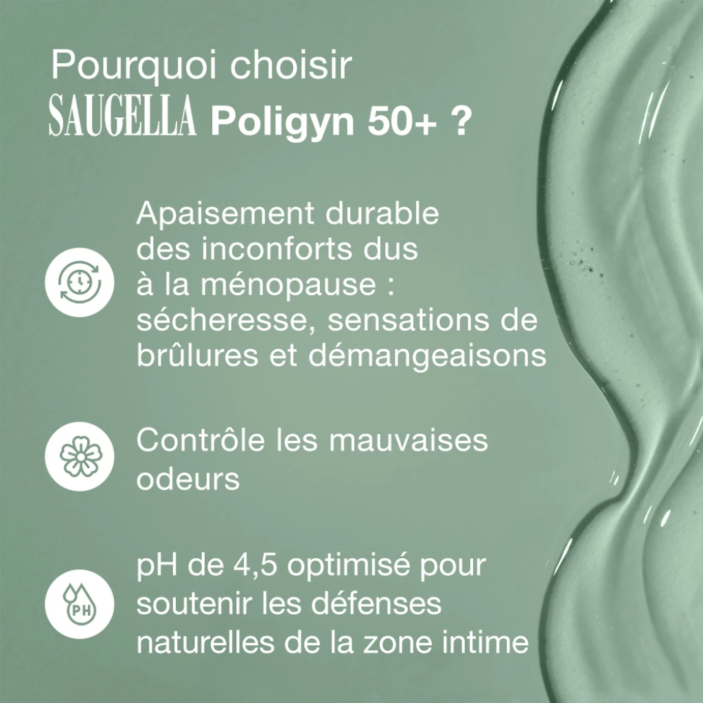 - Saugella Poligyn 50+ apaise la sécheresse, les sensations de brûlures, les démangeaisons ainsi que les mauvaises odeurs.