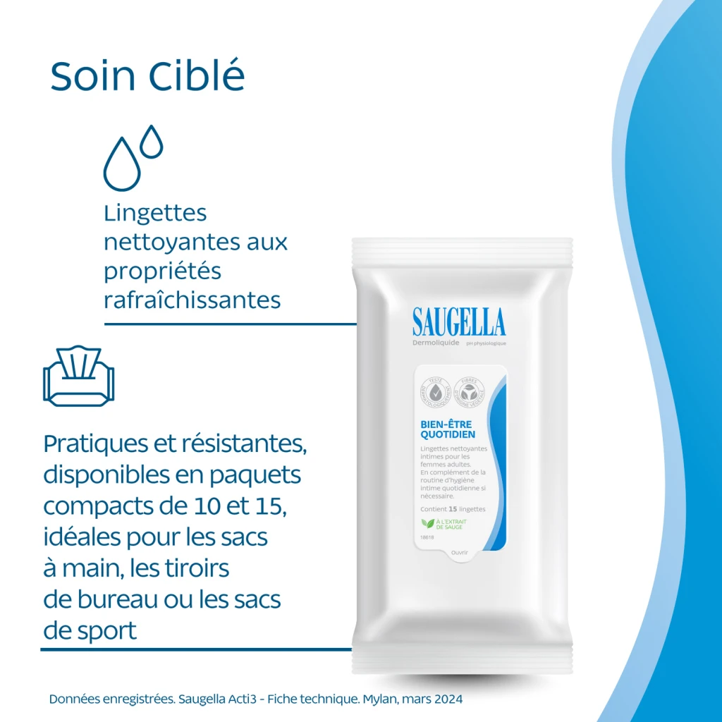 Pratiques et discrètes, ces lingettes féminines sont proposées en formats de 10 ou 15 unités, idéales pour être emportées partout. Que ce soit dans votre sac à main, votre tiroir de bureau ou votre sac de sport, les Lingettes Bien-Être quotidien Saugella Dermoliquide s'intègrent aisément à votre routine quotidienne.