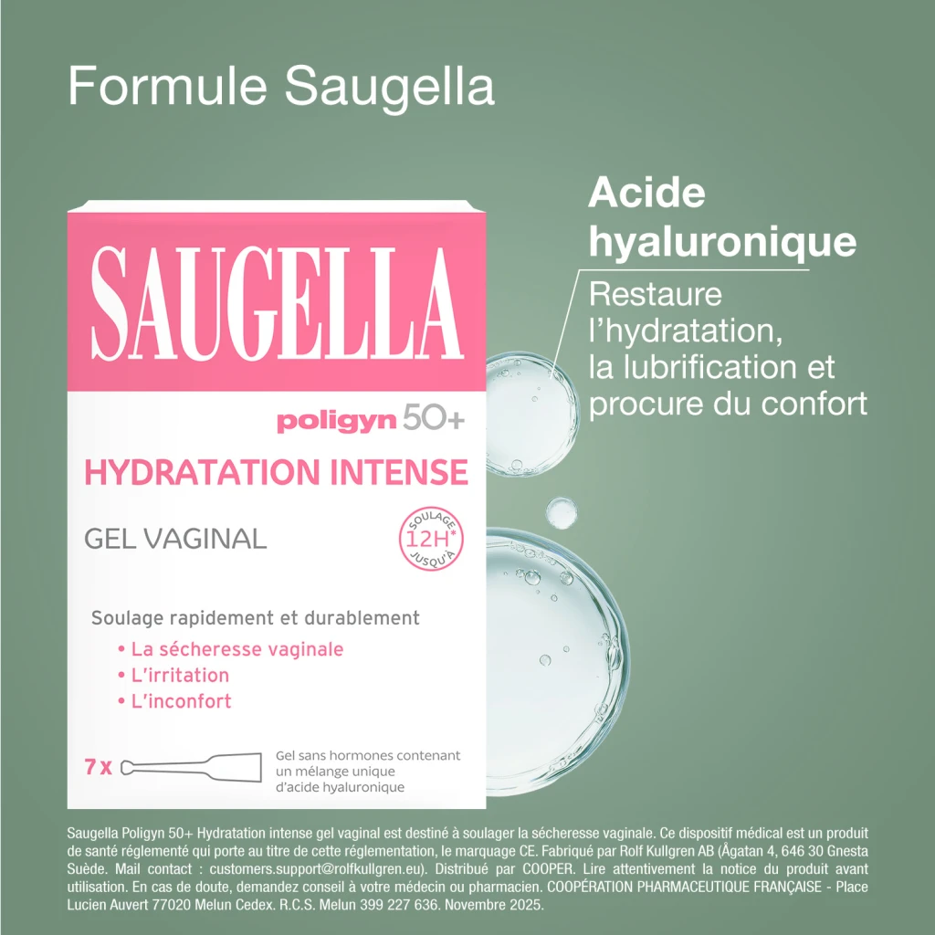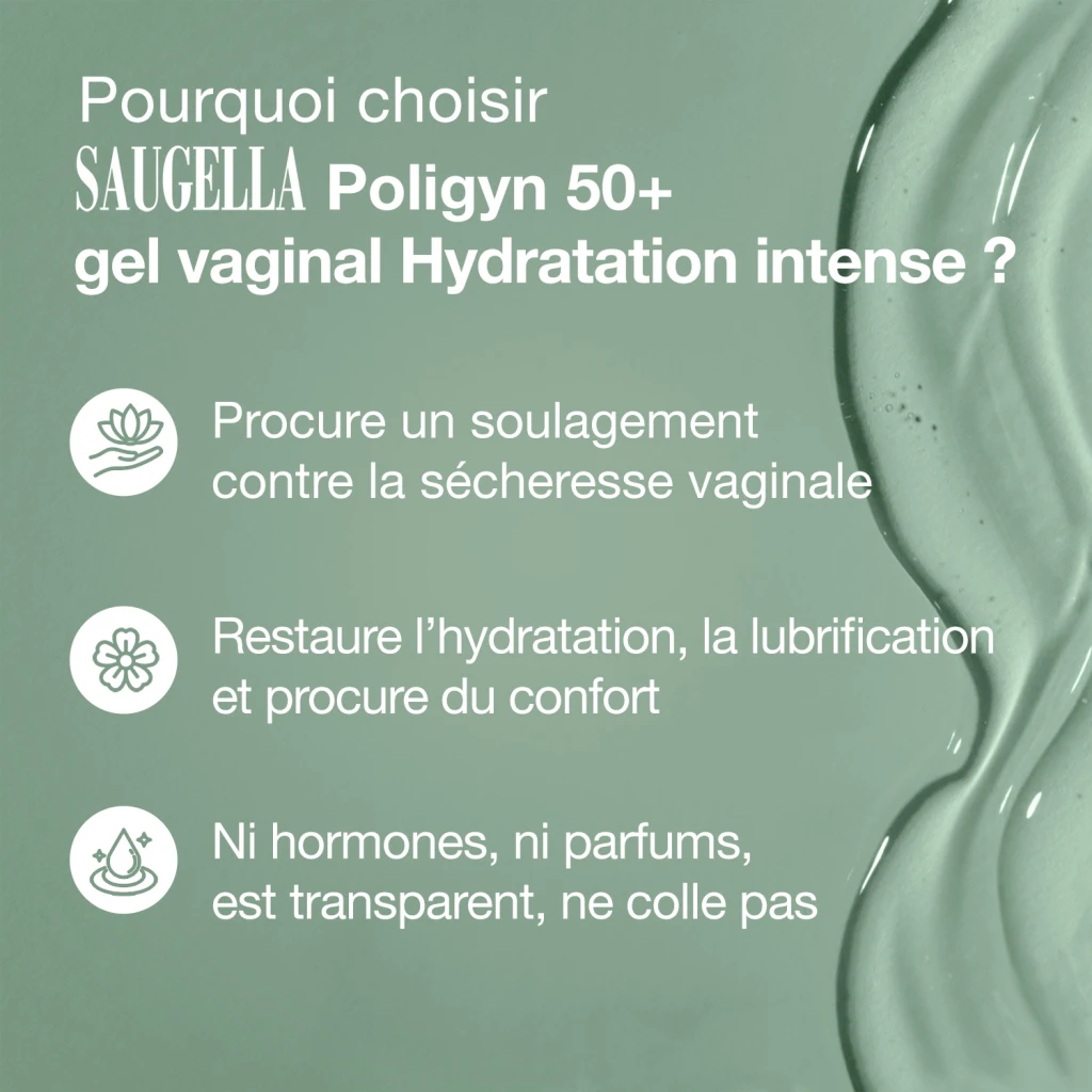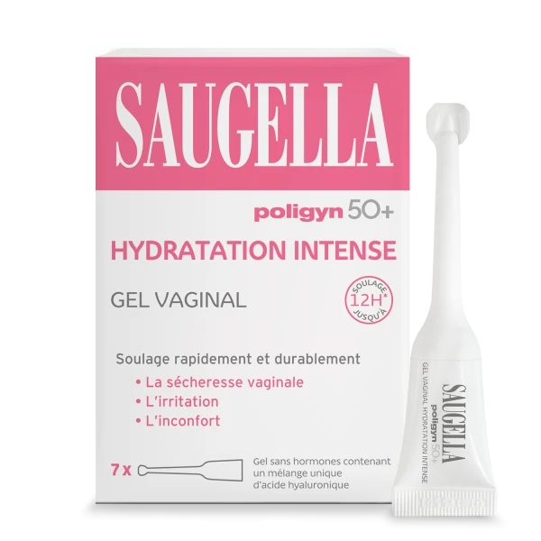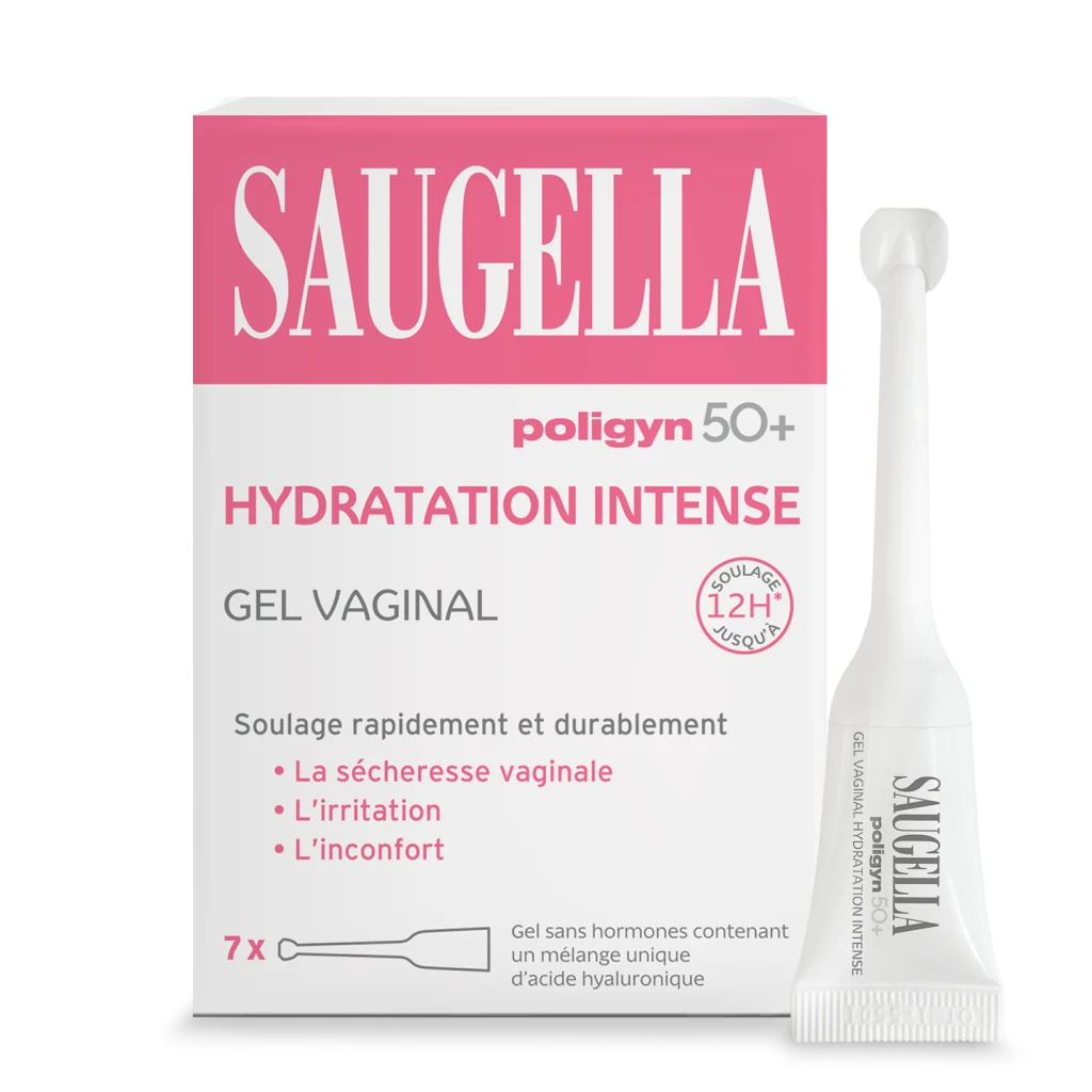 - Saugella Poligyn 50+ gel vaginal Hydratation Intense soulage la sécheresse, l’irritation et l’inconfort vaginal liés à la ménopause.